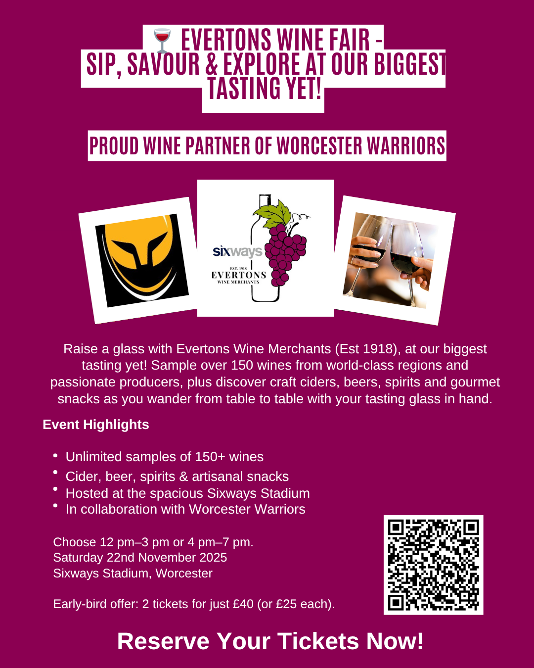 Raise a glass with Everton’s Wine Merchants (Est 1918), at our biggest tasting yet! Sample over 150 wines from world-class regions and passionate producers, plus discover craft ciders, beers, and gourmet snacks as you wander from table to table with your tasting glass in hand.